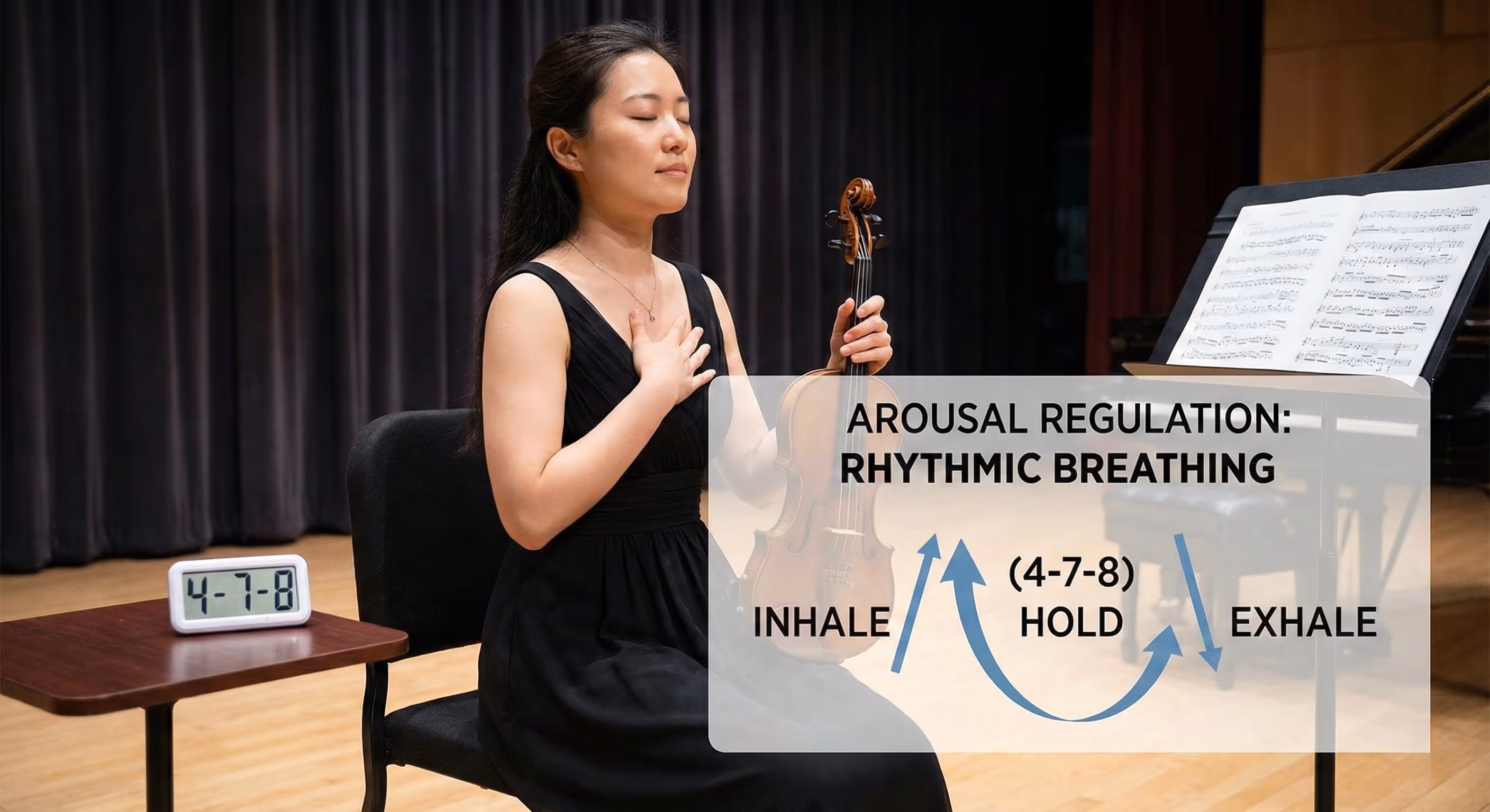One effective technique backed by research is rhythmic breathing. My paper discusses the effectiveness of breathing exercises in reducing anxiety for conservatory students. A common method is the 4 7 8 pattern where you inhale for 4 counts, hold for 7 counts, and exhale for 8 counts. It forces your nervous system to calm down. Integrating breathing exercises into your lessons can dramatically reduce physical symptoms of anxiety.