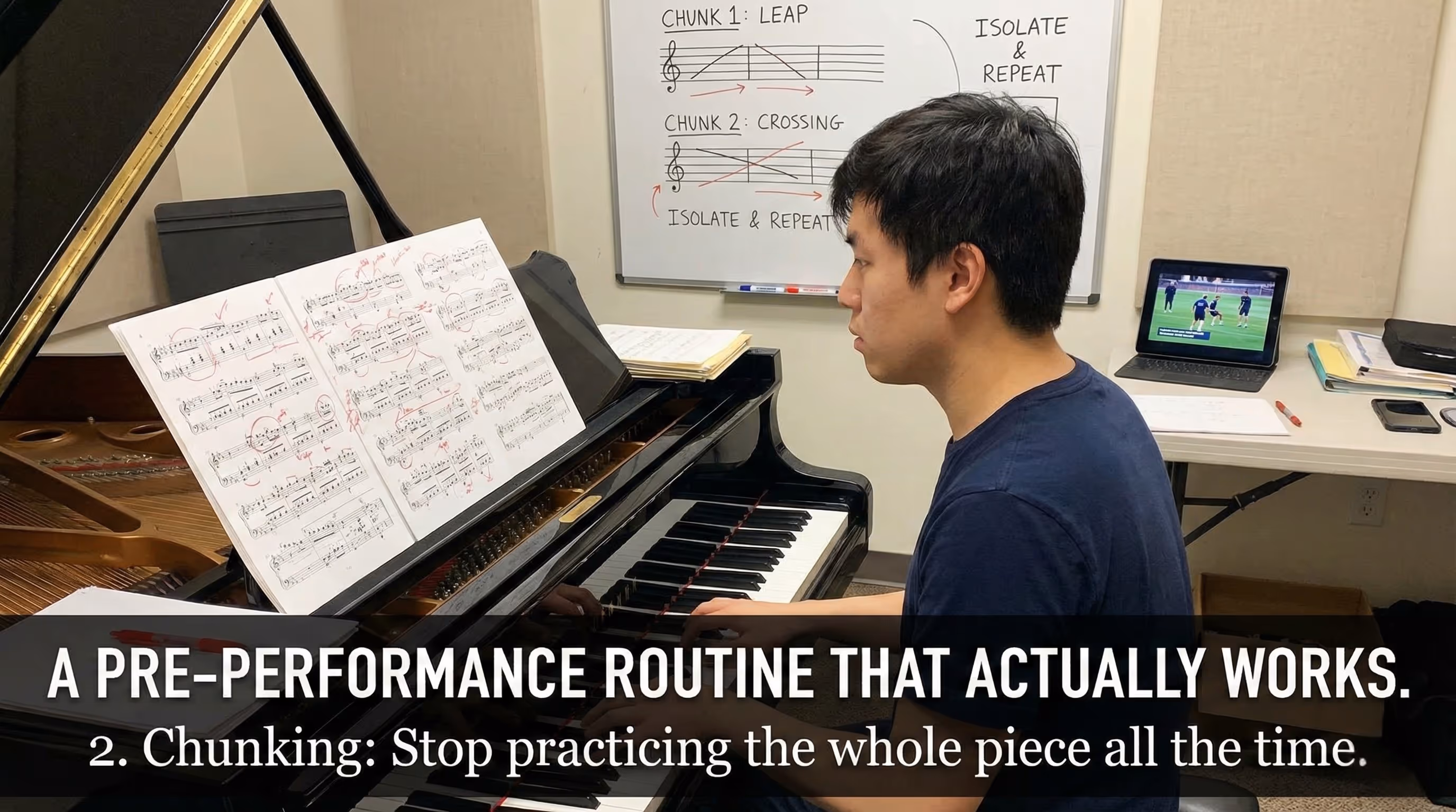 Chunking means breaking music into small performance units. Not just measures, but events: the leap into the chord, the voicing shift, the hand crossing, the entrance after a rest. You master each unit, then connect them.